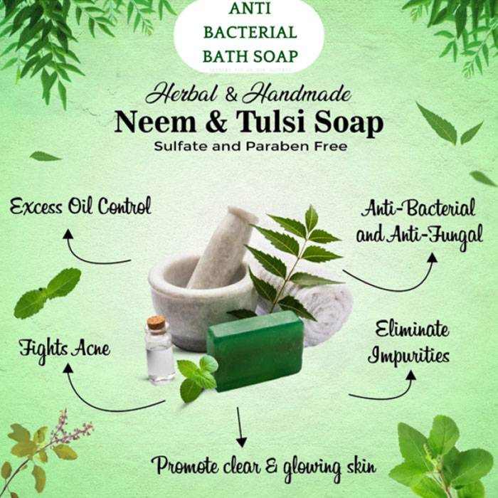 NEEM TULSI ANTI BACTERIAL BATH SOAP, crafted from the extracts of the neem tree (Azadirachta indica), is a popular natural skincare product in India. ItтАЩs renowned for its antibacterial, antifungal, and anti-inflammatory properties, making it beneficial for various skin concerns.