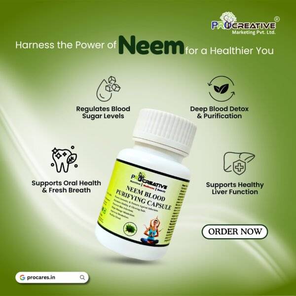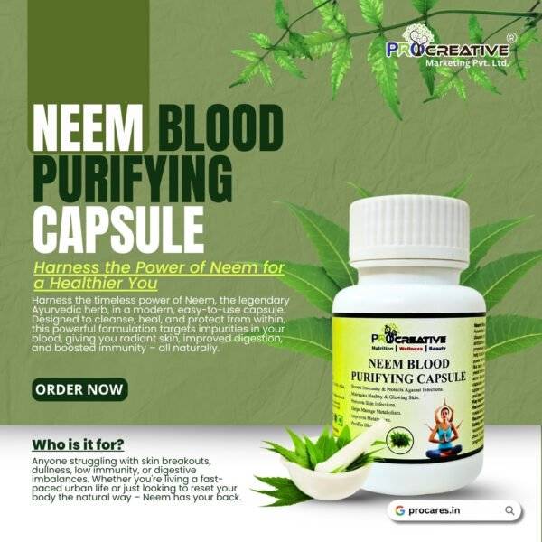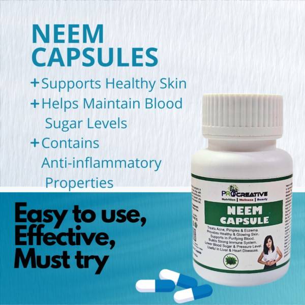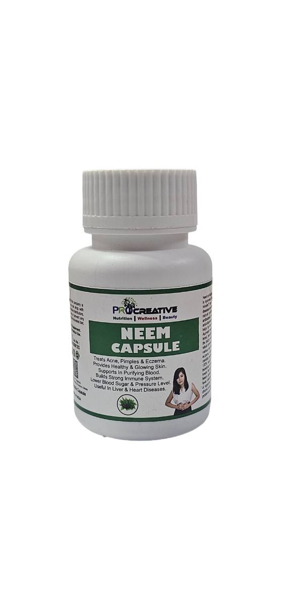 नीम एक दिव्य औषधि है। आयुर्वेद में इसे “सर्व रोग निवारिणी” कहा गया है, जिसका अर्थ है — सभी बीमारियों और रोगों का उपचार। नीम में अद्भुत प्राकृतिक जीवाणुरोधी, विषाणुरोधी, कीटाणुनाशक, जीवाणुनाशक, कवकरोधी, एंटीहिस्टामिन और सूजन-रोधी गुण होते हैं, जो विभिन्न स्वास्थ्य समस्याओं के इलाज में मदद करते हैं। आयुर्वेदिक नीम कैप्सूल रक्त को शुद्ध करता है, शरीर को विषमुक्त करता है और शरीर की रोग-प्रतिरोधक क्षमता को मज़बूत बनाता है। यह मुंहासे, पिंपल, एक्जिमा, खुजली, दाद, कुष्ठ रोग, कैंडिडा, सोरायसिस और यीस्ट संक्रमण जैसे विभिन्न त्वचा रोगों के इलाज में सहायक है।